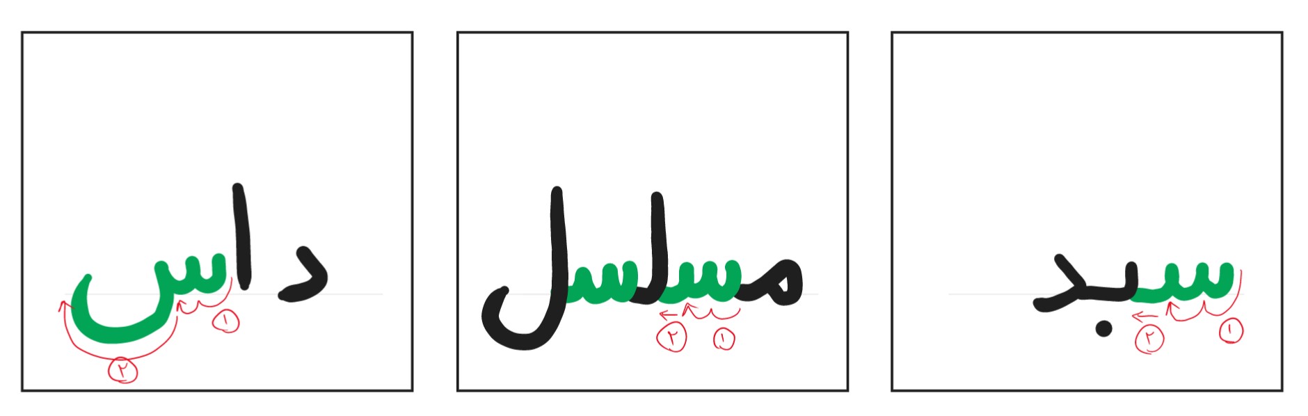 برای نوشتن حرف "سـ" غیر آخر، از کمی بالاتر از خط زمینه شروع کرده، سه دندانه رسم می کنیم و سپس روی خط زمینه، کمی به سمت چپ ادامه می دهیم.