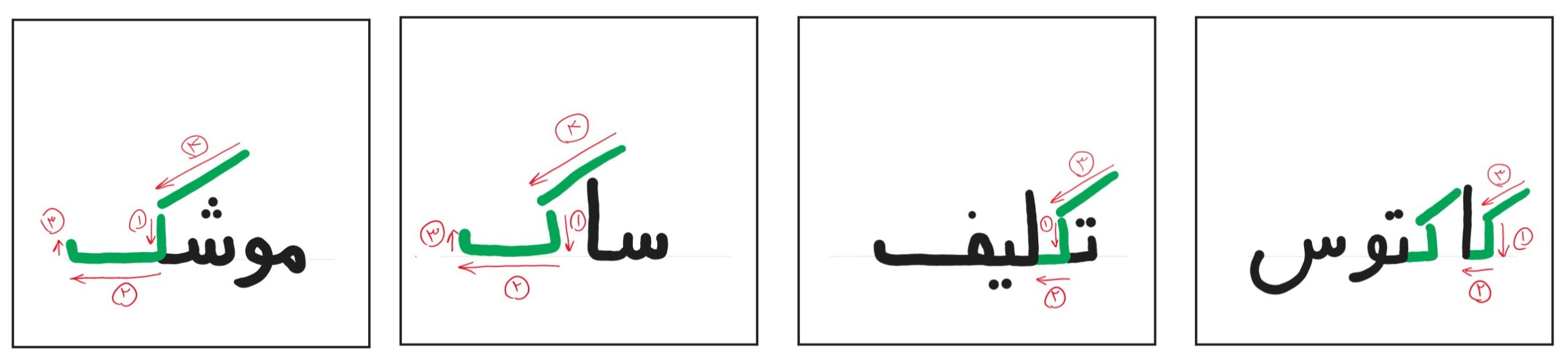 برای نوشتن حرف "ک" آخر، ابتدا از کمی بالاتر از خط زمینه، خطی کوتاه به پایین کشیده و روی خط زمینه، مقدار بیشتری به سمت چپ رفته و کمی به سمت بالا ادامه می دهیم. در آخر هم یک سرکش اوریب به بالای آن اضافه می کنیم.
